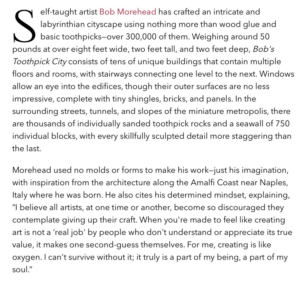 …..”Bob Morehead is a self-taught artist who creates incredibly intricate sculptures using only wood glue and toothpicks. Guided by his imagination, and inspiration from the Italian architecture along the Amalfi Coast where he was born, one of Morehead’s most elaborate cityscapes spans 10 feet in length and consists of over 400,000 toothpicks” — BOOM.com